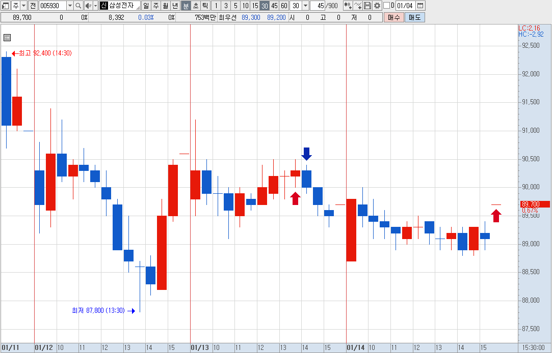 1월 12일~14일까지 3일간의 30분 봉이 나와 있습니다.