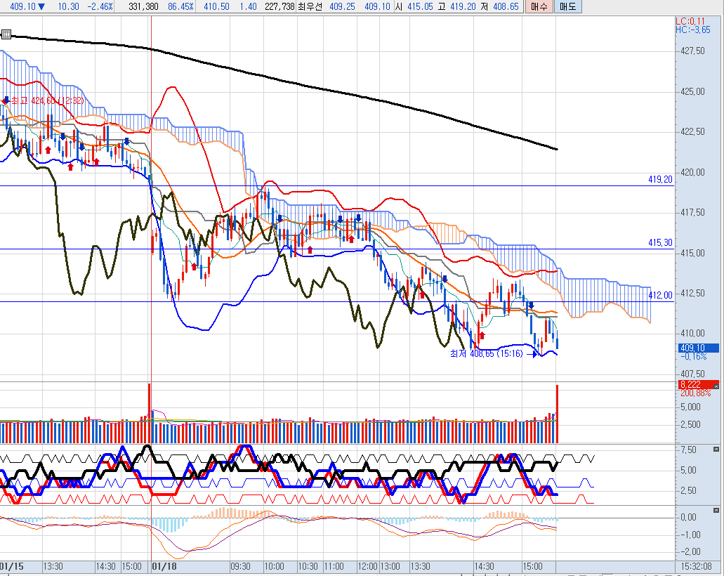1월 12일의 전저점인 415.30을 두고 공방을 벌였습니다.