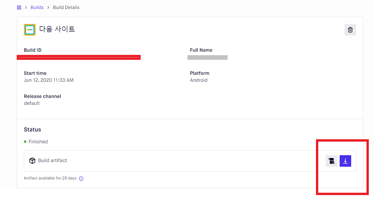빌드가 완료되면 파일을 다운로드 받을 수 있는 단추가 생기게 된다.