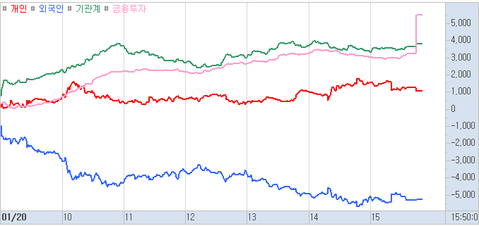 외국인은 줄곧 매도를 기관은 매수를 하였고, 그 사이에서 개인은 약간?의 매수로 대응했던 하루였습니다.