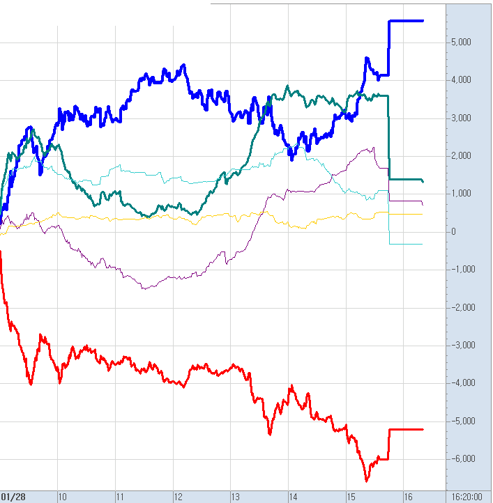 빨간색의 개인은 장초부터 매도를 시작하여 매도폭을 확대해 나갔습니다.