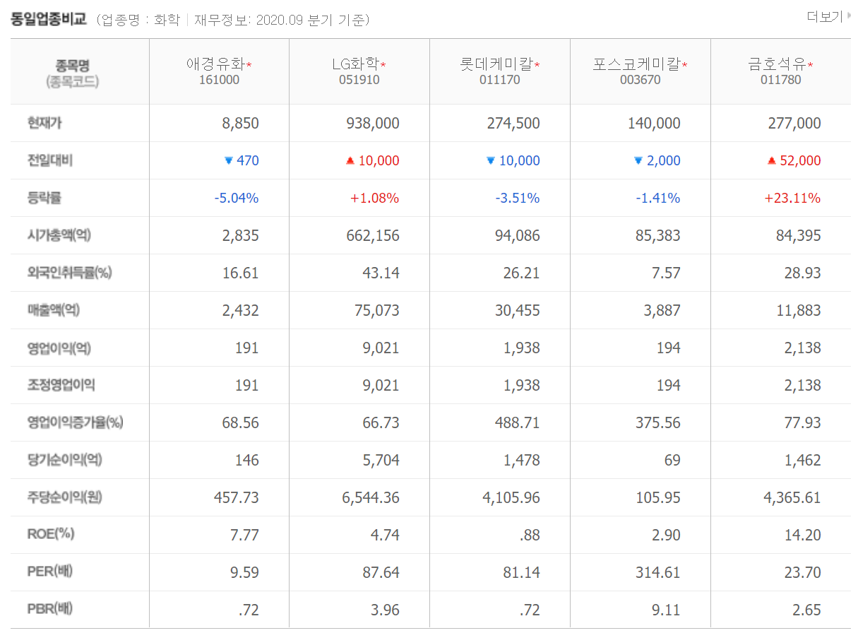 아래 동일 업종 비교를 보시면 다른 화학 관련 회사들과 비교할 수 있는데요,