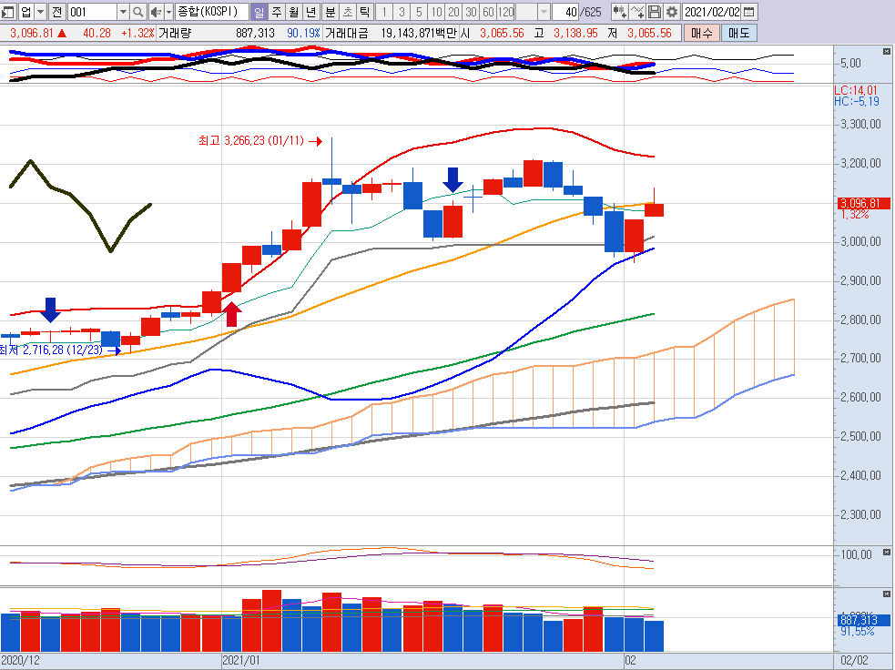 1월 8일부터 계속 그 자리를 맴돌고 있는 3140~3150 부근은 강한 저항으로 존재하고 있습니다.