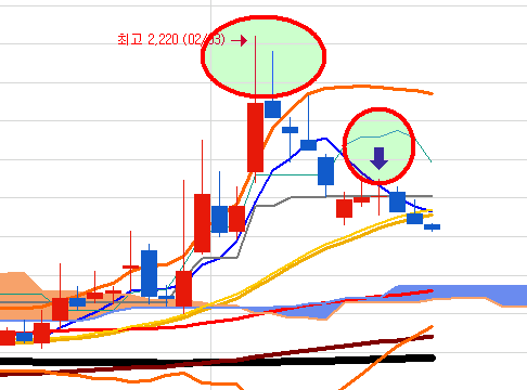 그리고 매각한 시점이 바로 아래 챠트에서 위에 원의 파란색부터