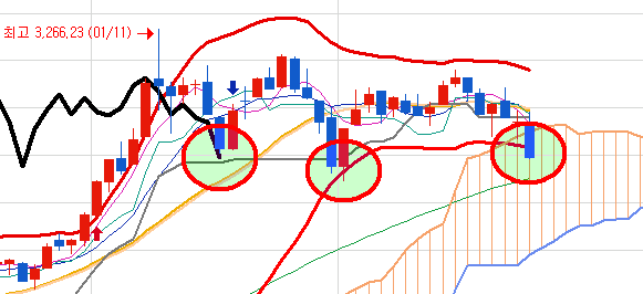 그래도 아래 챠트의 첫 번째 원처럼 매도 신호를 매수 신호로 덮으면서 올라가나 기대했던 적도 있습니다.