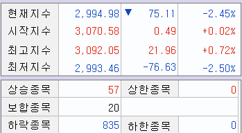 오늘 코스피는 2994.98로 3천을 내주면서 하락 마감했습니다.