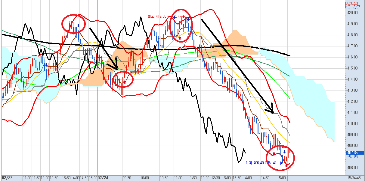 어제 장 마감은 매도 신호로 추세를 깨고 내려왔었는데요,