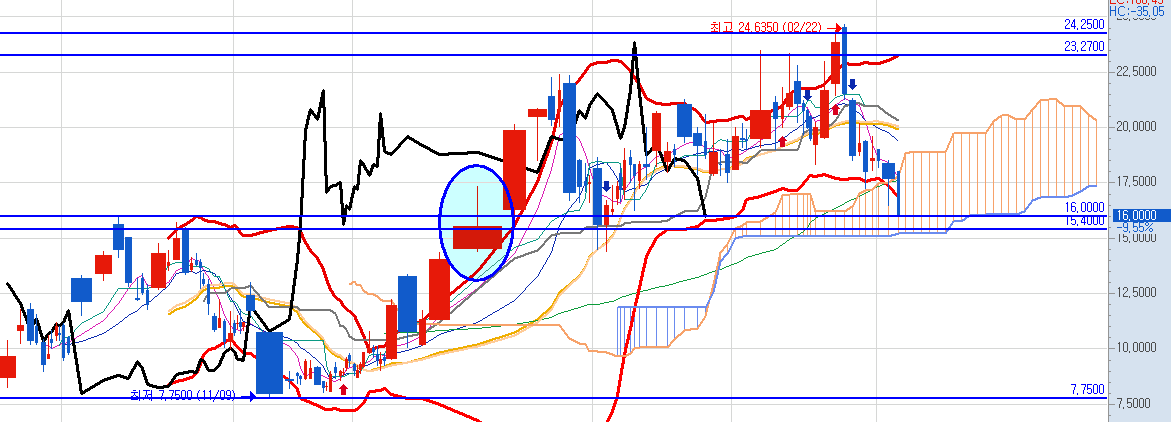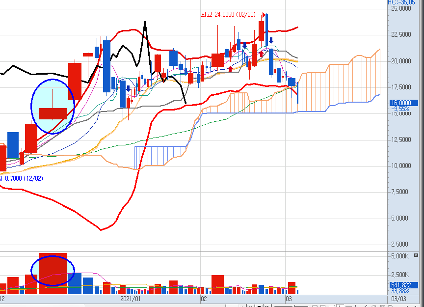현재 기댈곳은 저기 원 안에서 대량거래가 있었던 12월 18일의 봉의 위치입니다.