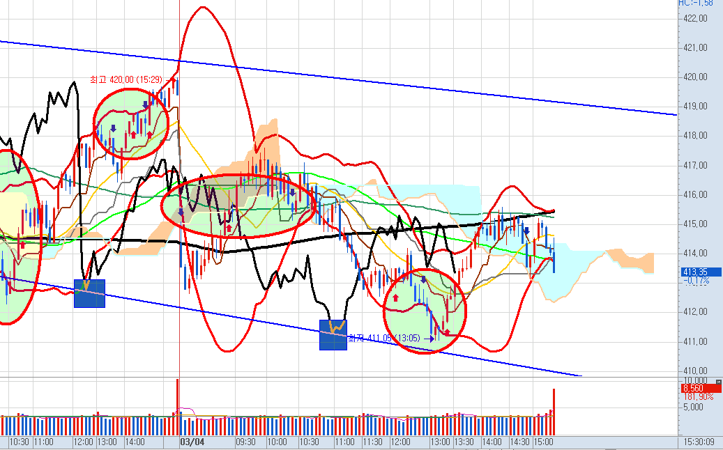 하지만 바로 매수 신호가 나오면서 반등하자 오늘의 고점을 만들고 바로 매도로 대응했습니다.