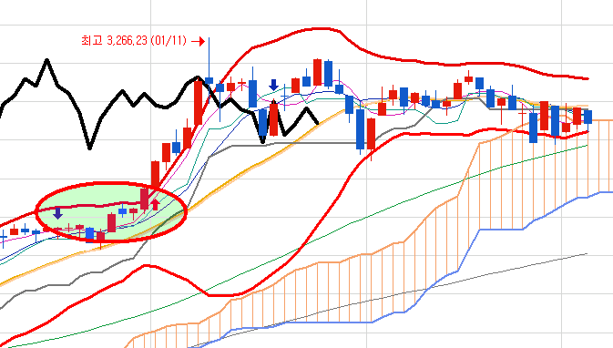 하지만 오늘의 저점은 코스피 일봉상의 볼밴 하단이었습니다.