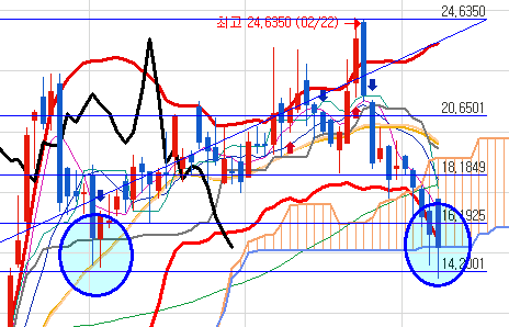 위 챠트를 먼저 보자면 여기에서 반등하는 방법은 급등 뿐입니다.