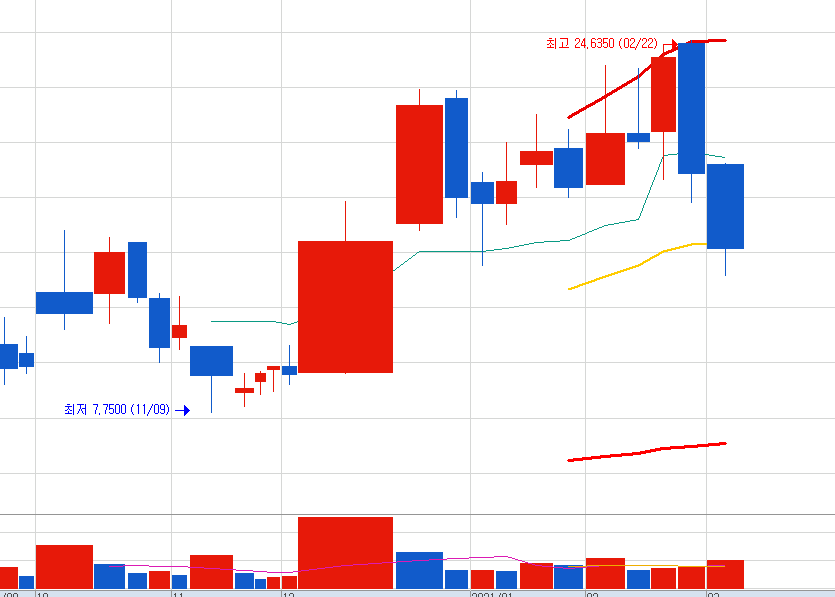 갭상승에 고가를 찍고 하락하면서 13달러대까지 갔다오는 조정이 있어습니다.