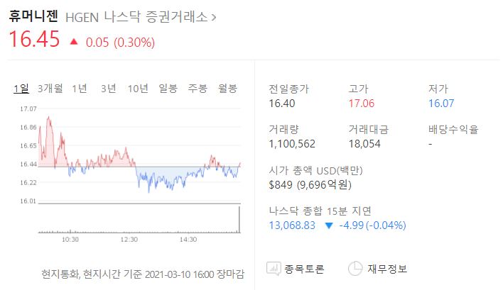 지난 밤(미국 시간 3월 10일 마감 기준) 휴머니젠은 상승으로 마감했습니다.