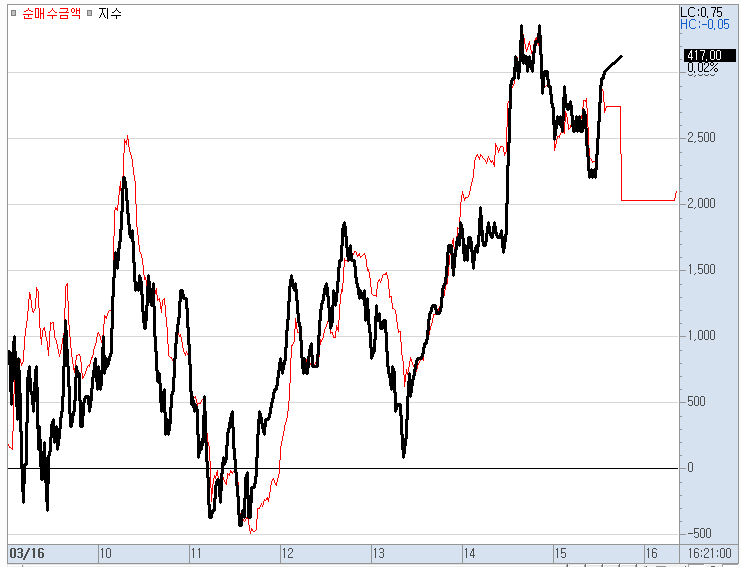 아래 주체별 매수 추이를 보시면 위에서 장을 올린 것이 외국인임을 알 수 있습니다.