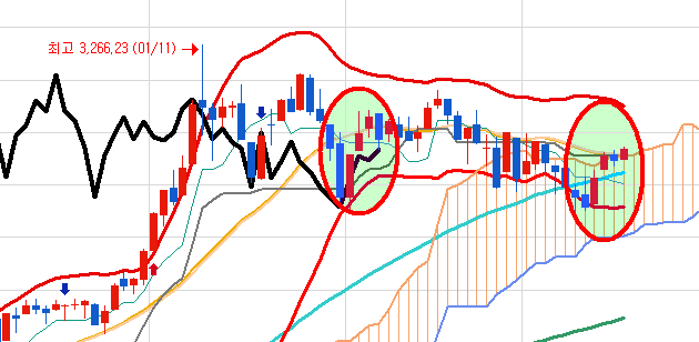 아래 두 개는 어제 지수의 상단과 하단을 표시한 것입니다.