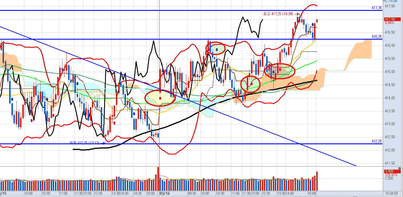 그런데 그 선을 넘지 못하고 417.25를 고점으로 찍고 밀렸다가 외복하면서 마감했습니다.