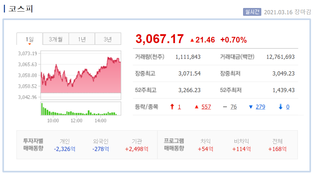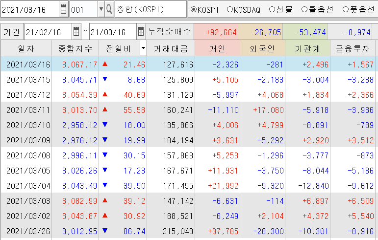| 조정받은 증시, 개인들의 코스피 대량매수! 2021.2.17 마감시황 (0) | 2021.02.17 |