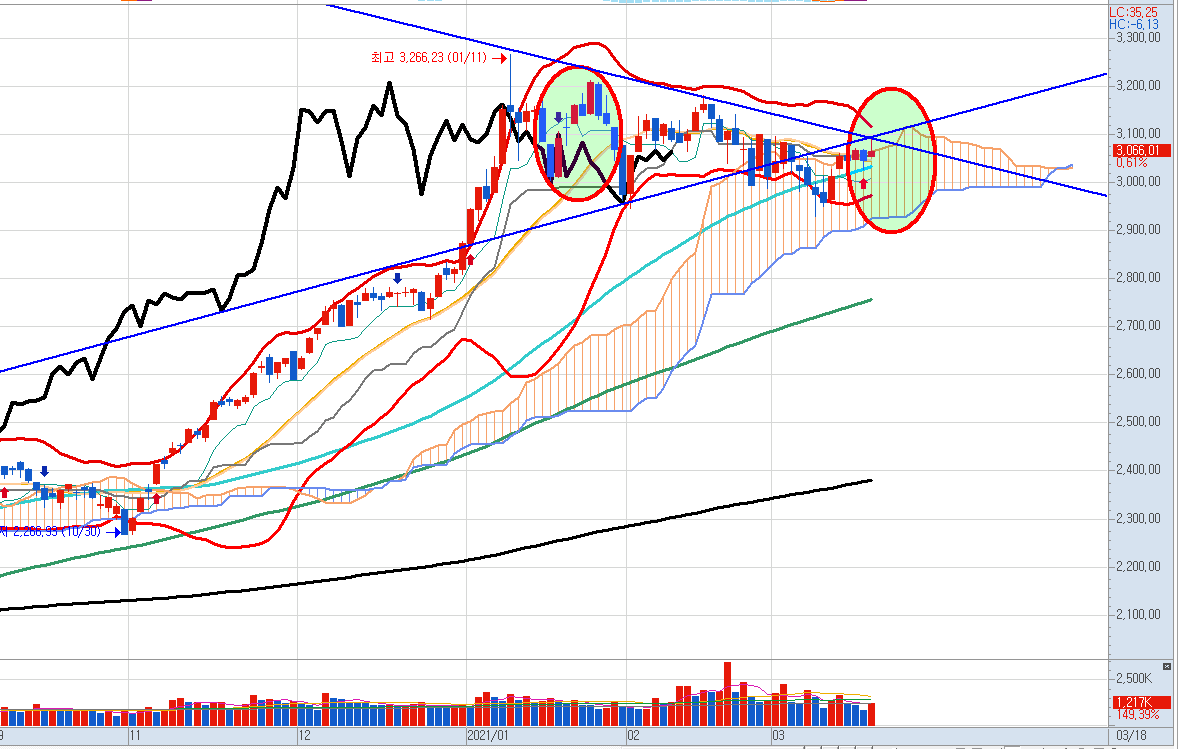 제일 위에서 움직인다면 위 코스피일봉 챠트상의 추세선이 한계가 될 것으로 보입니다.