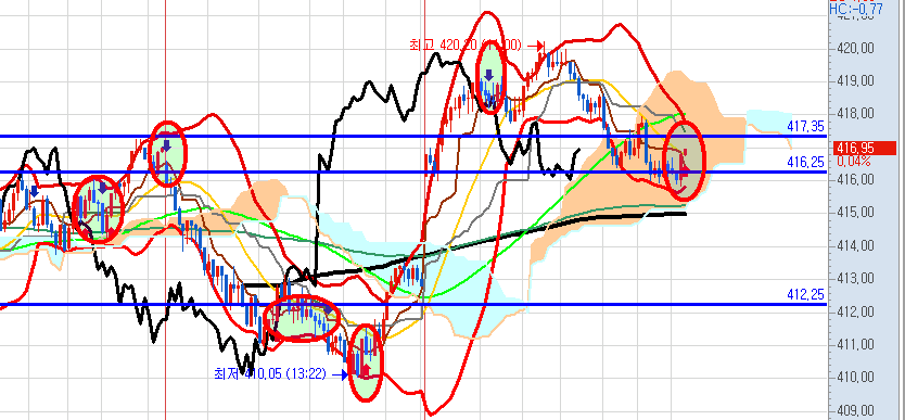 분봉도 상승과 하락이 상존하고 있는 상황이네요.