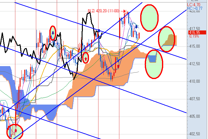 내일 장은 심플하게 아래 세 개의 원 중의 하나에서 움직이지 않을까 생각합니다.