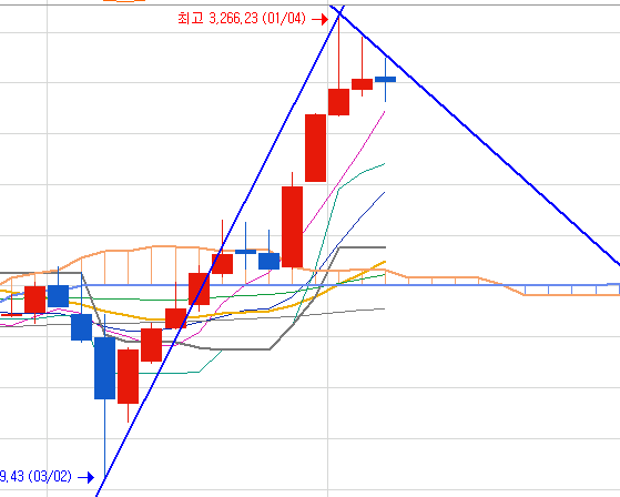 아래 첫 째 원의 모습에서 세력은 3200을 넘기는 상승으로 올릴 때