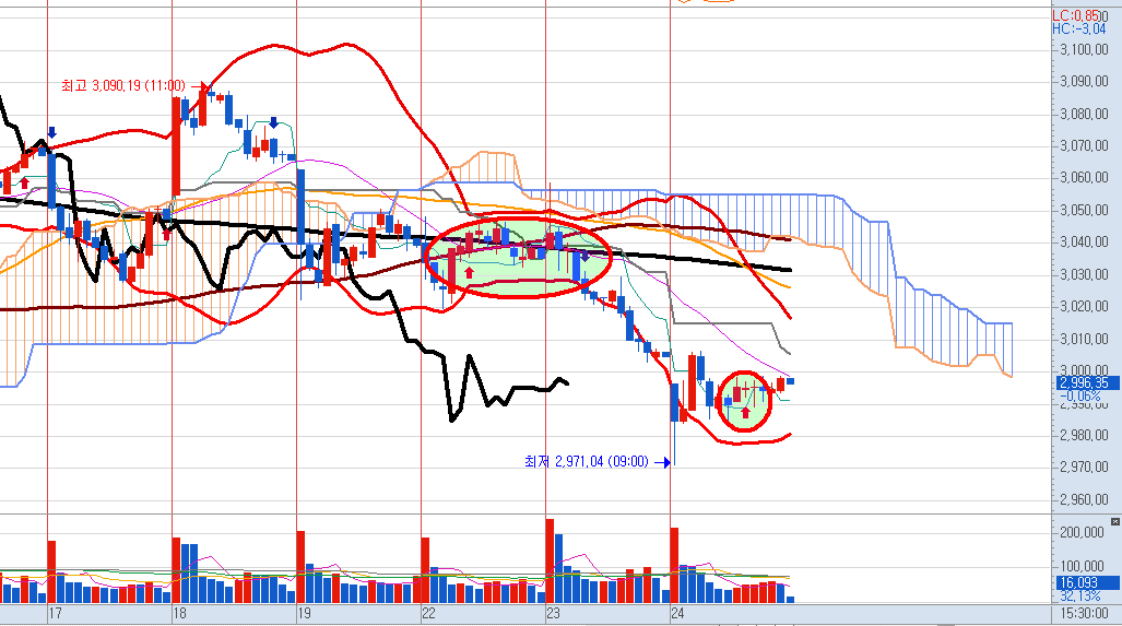 오늘 저가는 2971 포인트로 어제 예상했던 가격보다 더 내려와 꽂혔습니다.