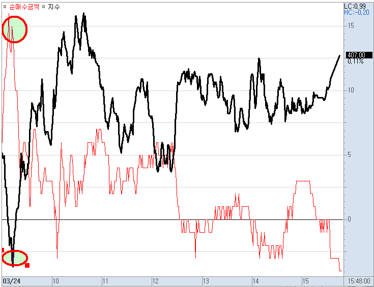 매수로 돌아서면서 지수도 돌아섰습니다.