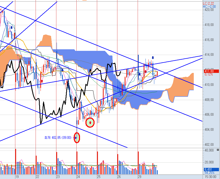 추세선 위에 있지만 내일 갭하락으로 쉽게 깨지기 쉬운 자리입니다.