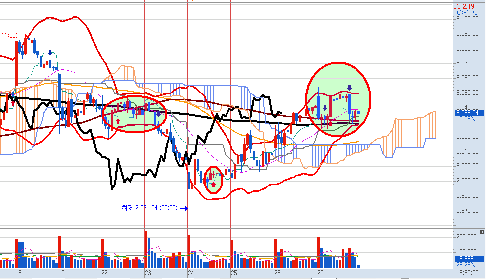 코스피 5분봉 챠트를 보니 초기 흐름이 예상과 부합되는 흐름이었습니다.