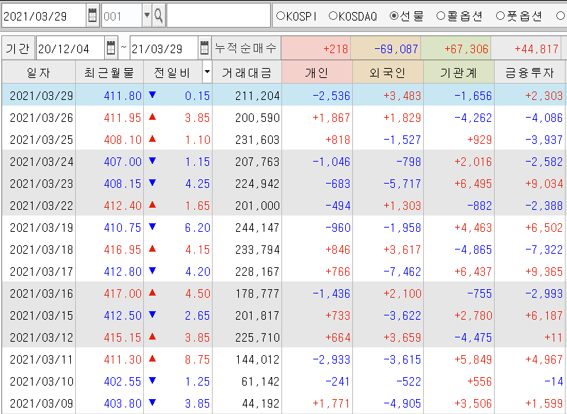 선물 수급 동향을 보면 외국인들이 장이 떨어지는 것을 방어하는 느낌입니다.