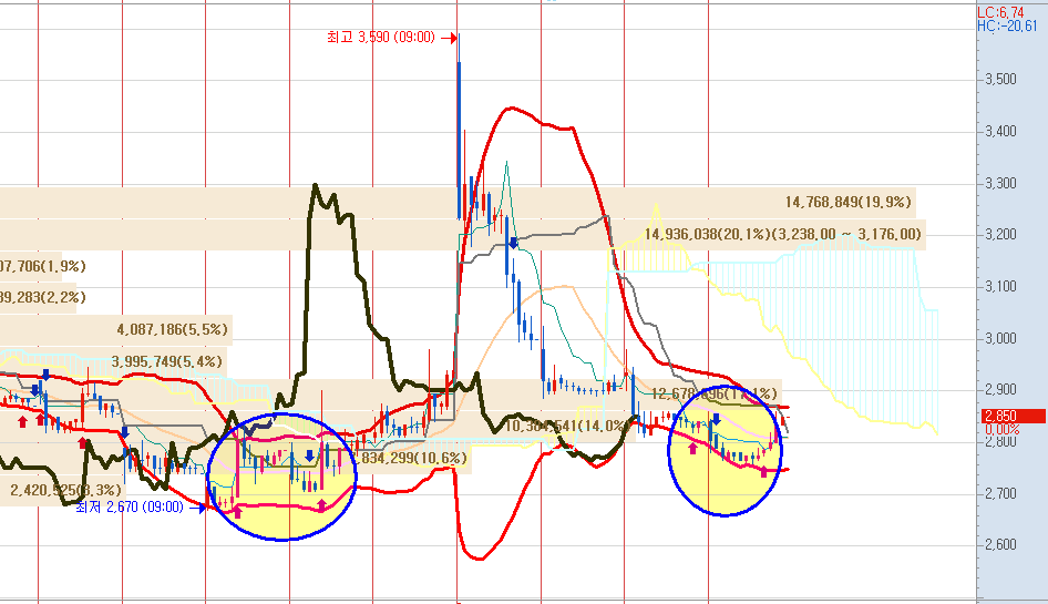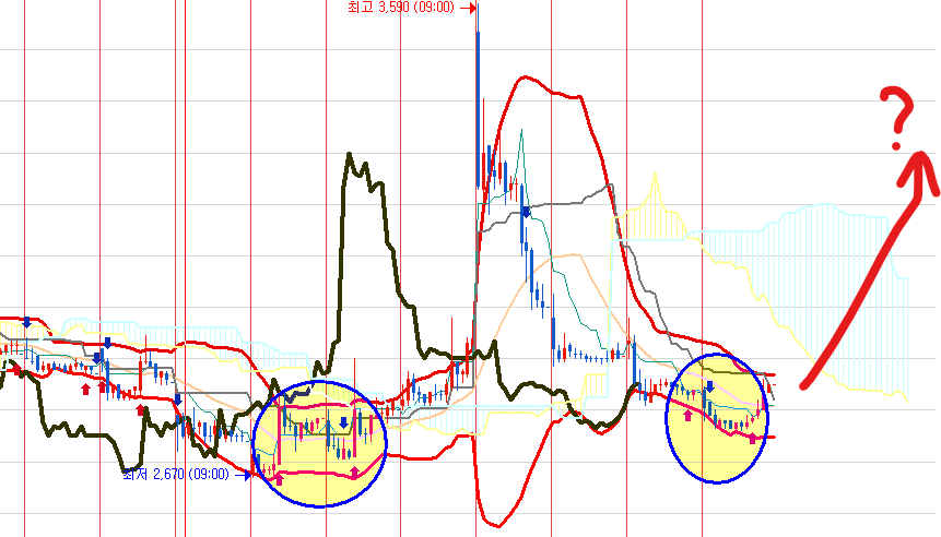 지난 급등 전에 원 안의 모습이 바로 매수/매도/매수 신호를 발생시키며
