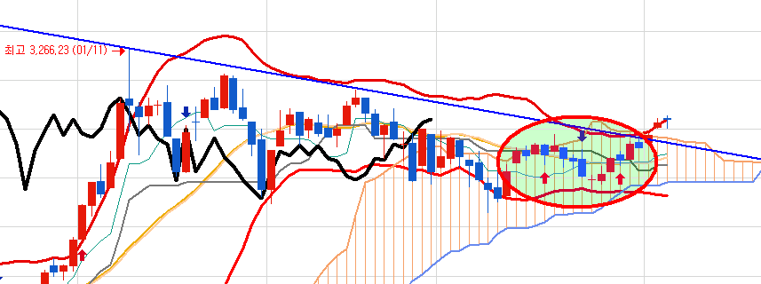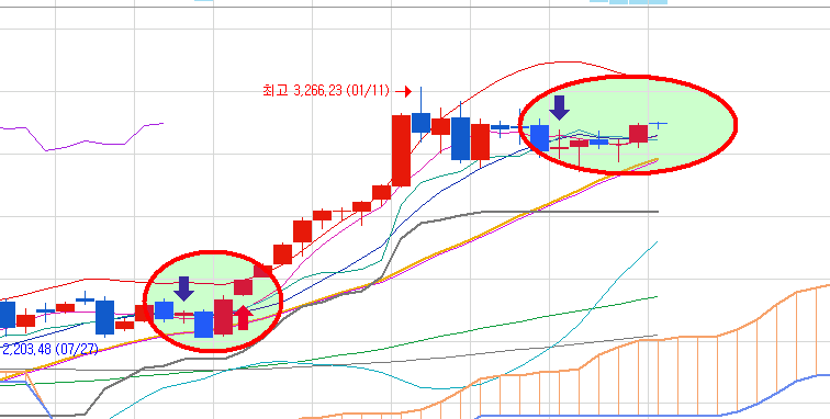 왼쪽 원의 모습을 보면 결국 그렇게 하다가 매수 신호가 나오면서 급등했었습니다.