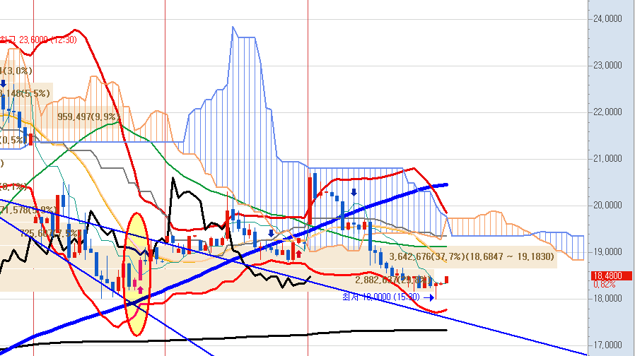 좋은 방향으로 본다면 위 챠트의 원안에 위치까지 다시 내려온 것이라