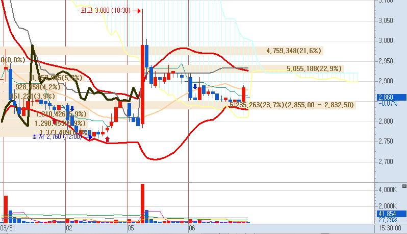 분봉 상으로 상승 추세도 아직은 유지하고 있습니다.