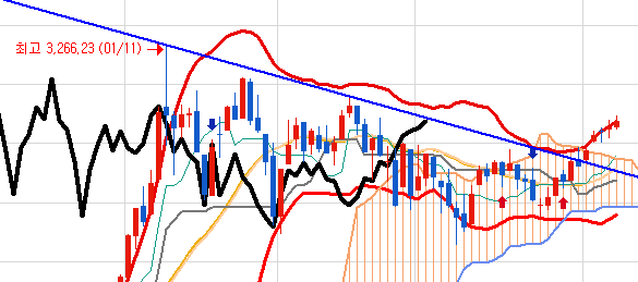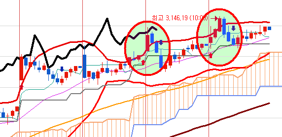 어제의 매수 신호를 이어받아 상승하다가 매도 신호를 만났으나 바로 매수신호로 한 번 더 올렸습니다.