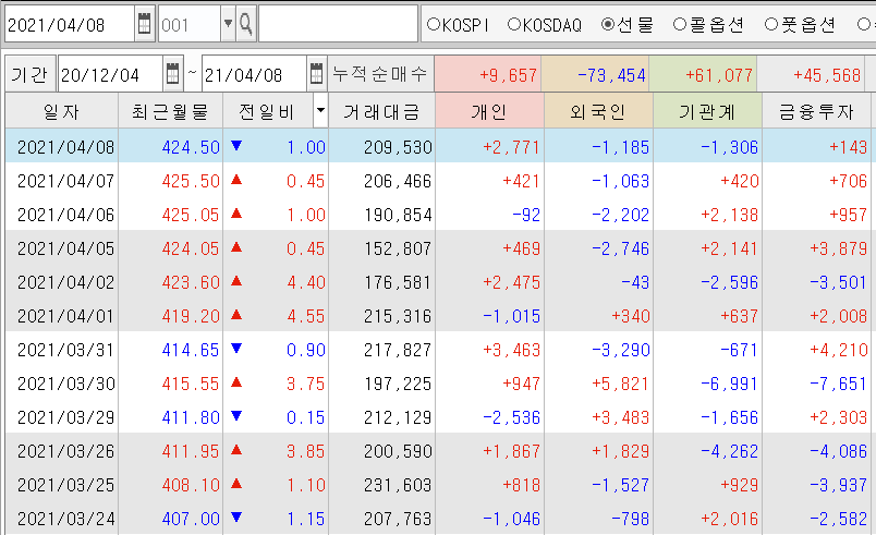 | 코스피 선물시장 장마감 시황 (1) | 2021.04.05 |