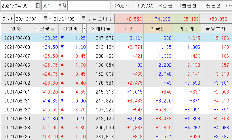 | 코스피 선물시장 장마감 시황 (1) | 2021.04.05 |