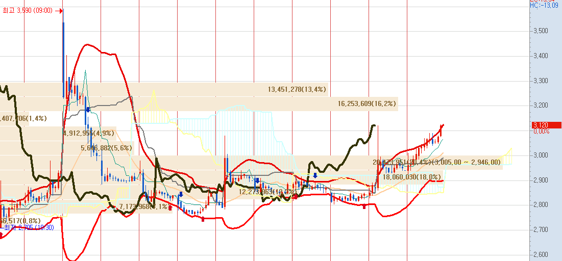 아래 매물대를 보면 이제는 3200원을 향해 달려가고 있다는 것을 볼 수 있습니다.
