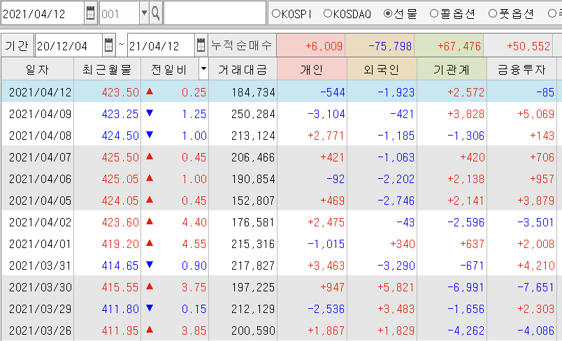 | 만기 앞두고 계속 양매도장 코스피/선물 시장 마감시황 (0) | 2021.04.07 |