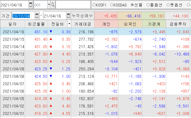 | 상승의 끝은 어디인가? 코스피/선물 장 마감시황 (2) | 2021.04.19 |