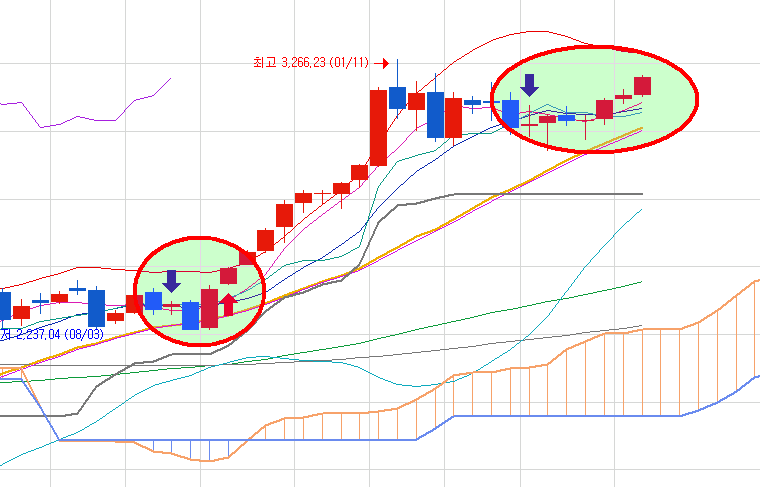 심지어 주봉으로 매도 신호 중인데도 그런 것을 보면 상당히 강한 모습을 보여주고 있습니다.