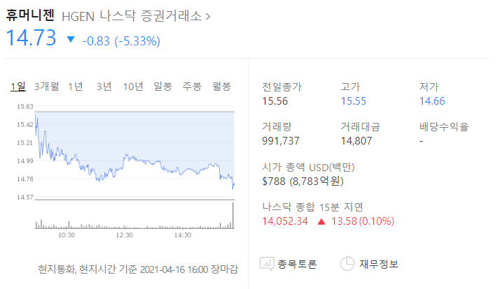 지난 밤 오늘 새벽 (미국 시간 4월 16일 마감 기준) 휴머니젠은 5.33% 하락한 14.73 달러로 마감했습니다.