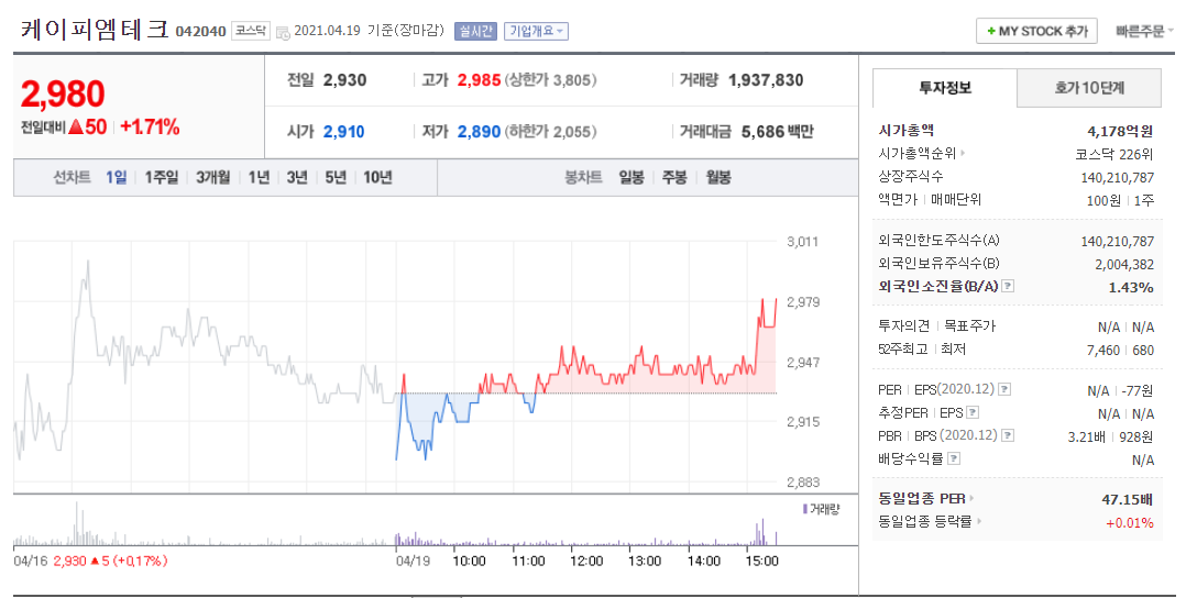 | 살아있네~ 케이피엠테크 장 마감시황 (0) | 2021.04.20 |