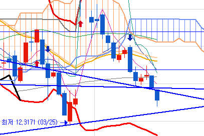 몇 일간의 진행으로 추세선이 올라오기는 했지만 13.2달러 정도가 마지노선이 됩니다.