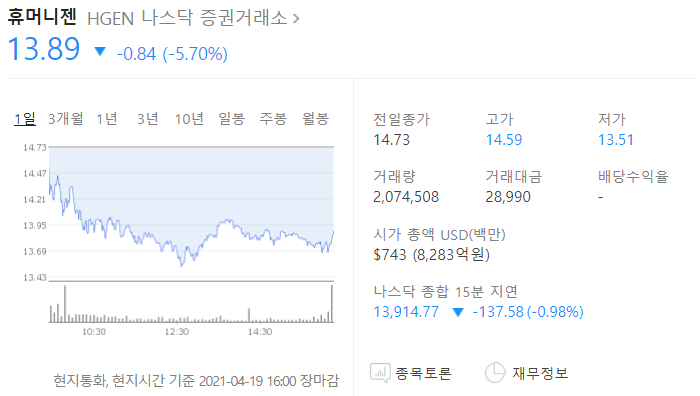 오늘 새벽 (미국 시간 4월 19일 마감 기준) 휴머니젠은 하락 마감하였습니다.