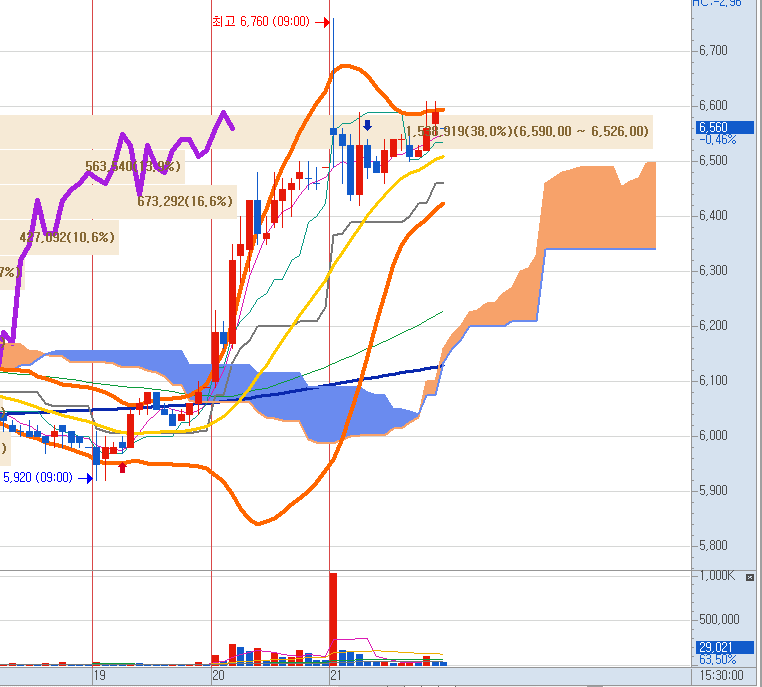 분봉으로 매물대에 갖혀 있기 때문에 이 구간을 잘 지나가야 하는 상황입니다.