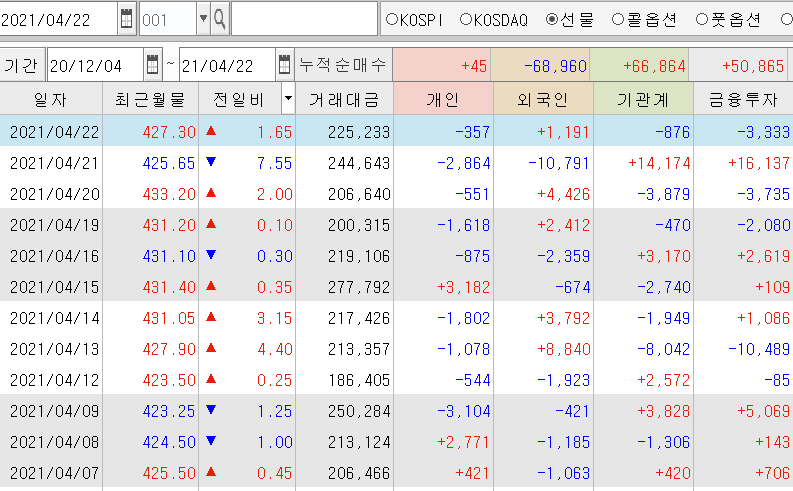 | 코스피 선물 선물 장중 시황 (3) | 2021.04.23 |