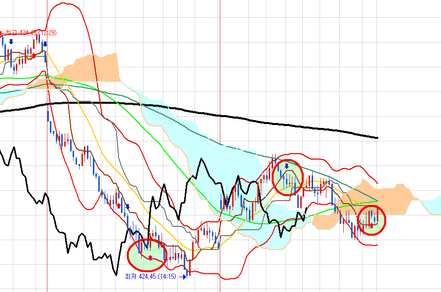 분봉을 보면 원 안의 급락 신호 후에 작은 원에서 매수 신호가 나오기 직전 끝난 장을