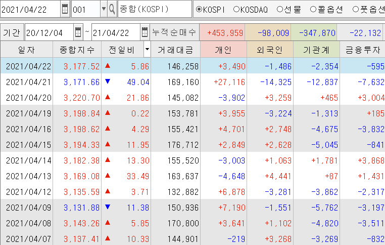 | 상승의 끝은 어디인가? 코스피/선물 장 마감시황 (2) | 2021.04.19 |