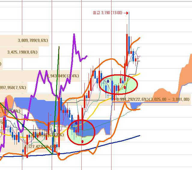 아래 분봉에서 어제 오늘 세력의 흔적이 보였습니다.